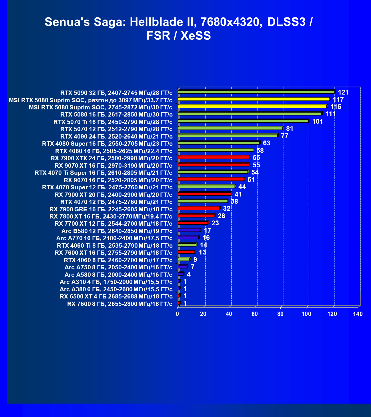 | 02 | MSI RTX 5080 Suprim SOC, разгон до 3097 МГц/33,7 ГТ/с | 14409 | 823 | 175 000 |
