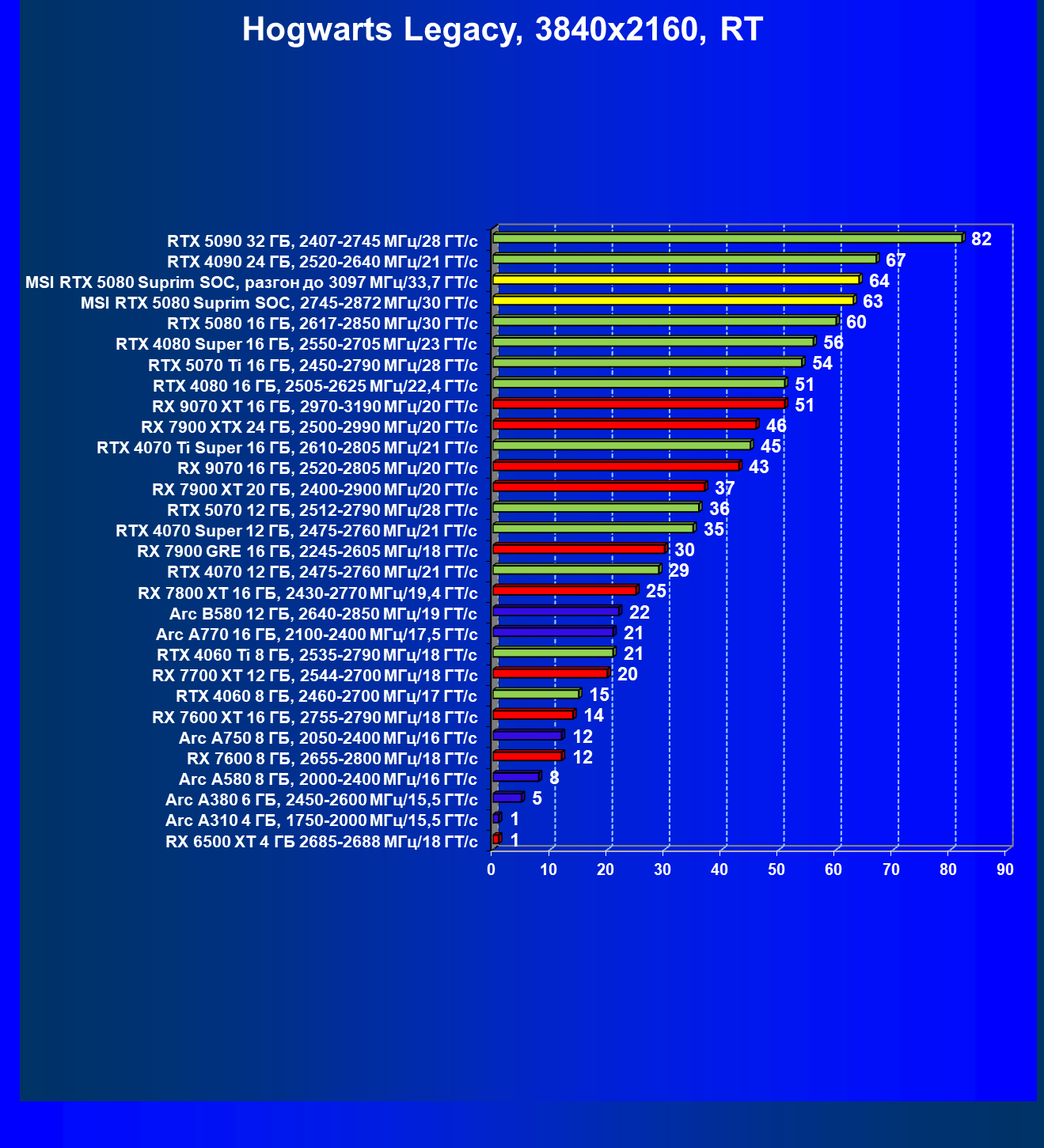 | 13 | RX 7900 XTX 24 ГБ, 2500—2990 МГц/20 ГТ/с | 6254 | 526 | 119 000 |