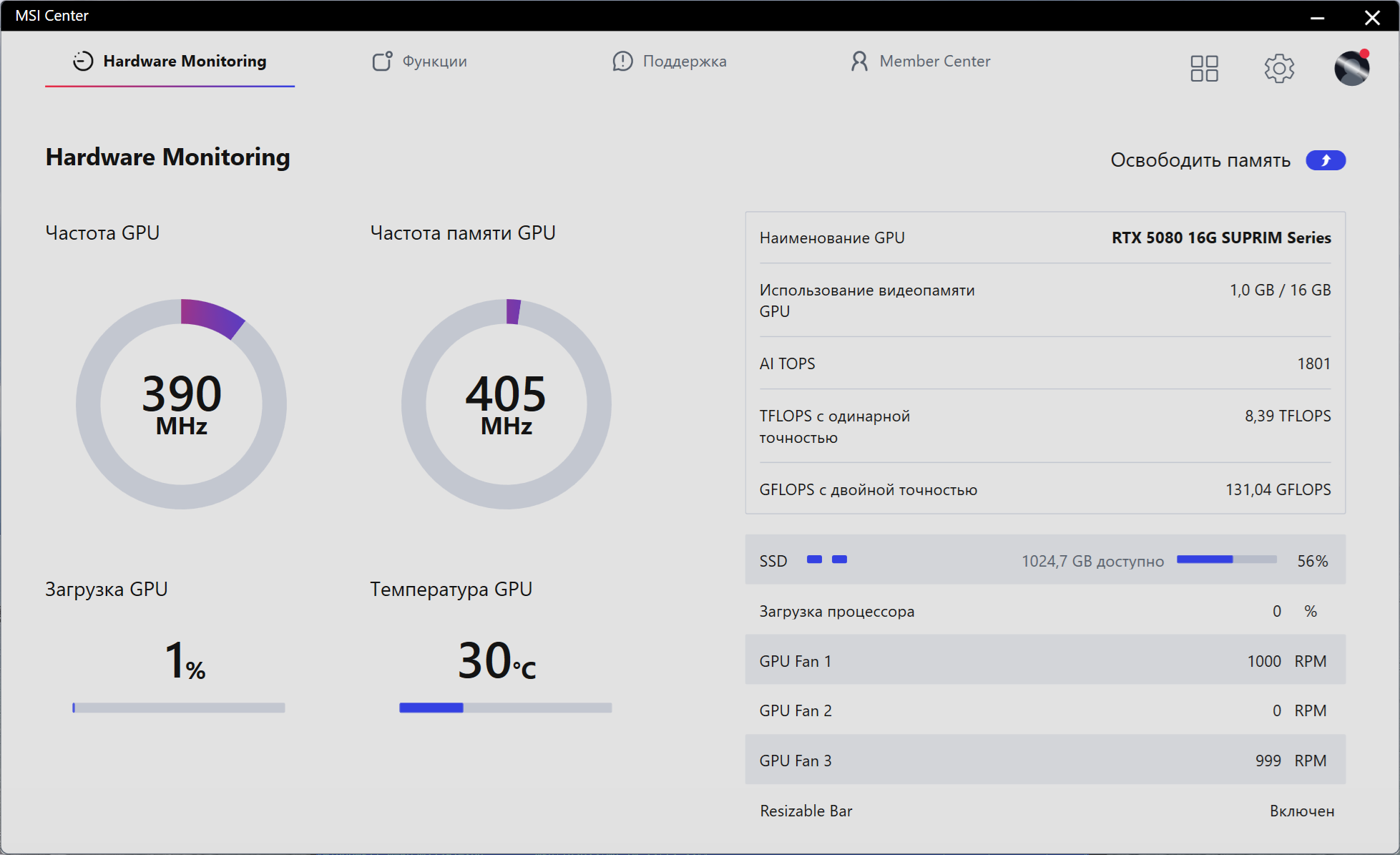 Управление работой карты обеспечивается с помощью фирменной программы MSI Center, мы о ней уже много раз писали: программа предоставляет упрощенное управление вентиляторами, частотами работы карты и напряжением ядра, слежение за состоянием карты (мониторинг) и многое иное.