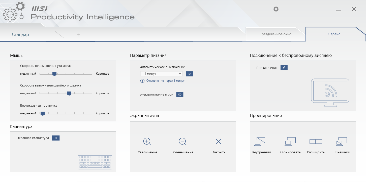 Там же можно найти программу MSI Productivity Intelligence. Она позволяет с компьютера изменять некоторые настройки монитора. Кроме того, в этой программе есть функция, упрощающая распределение окон на рабочем столе. Дополнительно можно поменять ряд системных настроек.