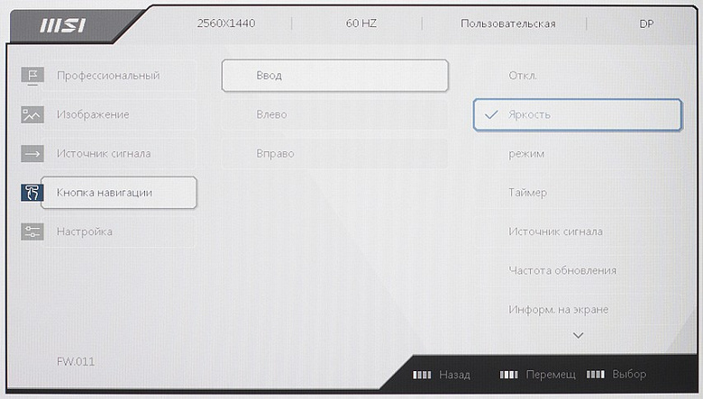 Индикатор питания при работе светится белым, в режиме ожидания — оранжевым и не горит, если монитор условно (механического выключателя питания, к сожалению, нет) выключен. Когда на экране нет меню, то при первом нажатии на первую (если слева направо) кнопку выводится меню с настройками. На вторую, третью и на четвертую кнопки — ползунок или список/короткое меню той настройки, которая назначена пользователем на данное действие.