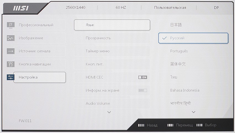 Навигация в принципе удобная, но неудобство могут вызвать сами кнопки, списки зациклены. В нижней части меню есть подсказка по функциям кнопок. При настройке изображения меню остается на экране, что немного мешает оценке вносимых изменений. При необходимости можно настроить уровень прозрачности фона и выбрать задержку автоматического выхода из меню. Есть русская версия экранного меню. Кириллический шрифт ровный, качество перевода на русский язык приемлемое.