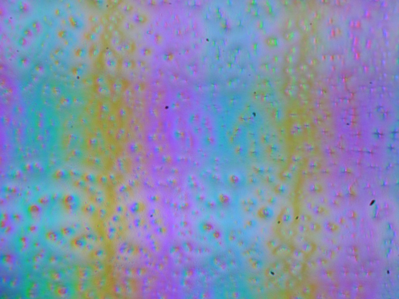 Зерно этих дефектов в несколько раз меньше размеров субпикселей (масштаб этих двух фотографий одинаковый), поэтому фокусировка на микродефектах и «перескок» фокуса по субпикселям при изменении угла зрения выражены слабо, из-за этого нет и «кристаллического» эффекта.