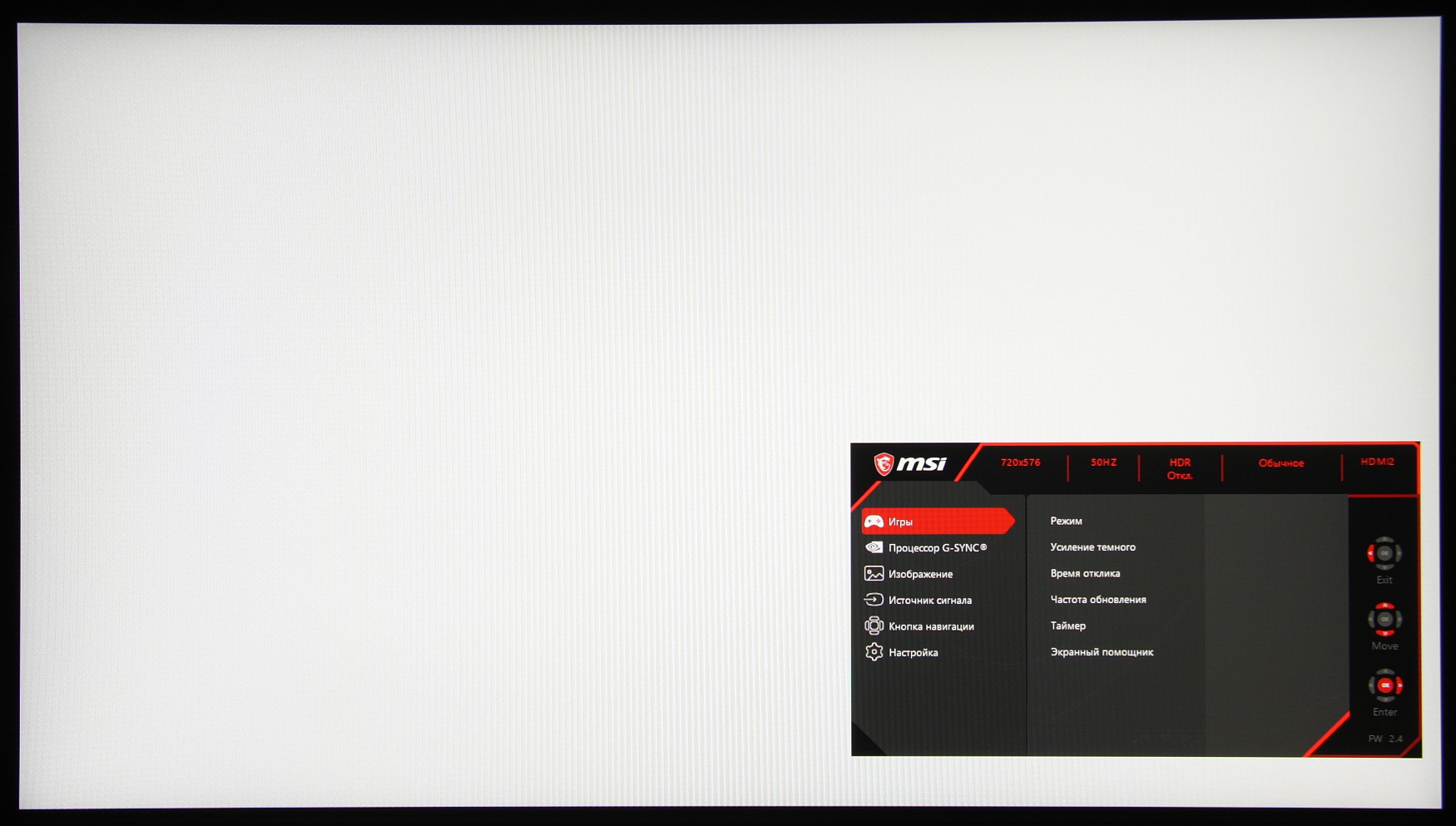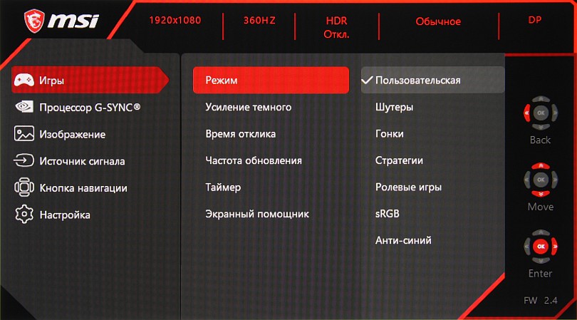 Можно настраивать яркость (прямо в нитах) и контрастность, для цветовой температуры выбирать один из трех предустановленных профилей или вручную настраивать цветовой баланс регулировками усиления трех первичных цветов. Для компонентных сигналов есть возможность принудительно включить режим sRGB (хотя в данном случае необходимости в этом нет). Присутствует и режим с низкой интенсивностью синей компоненты. В дополнение к выбору профиля гамма-коррекции есть настройка (Усиление темного), изменяющая различимость градаций в тенях, что может пригодиться в играх с темными сценами. Также можно регулировать разгон матрицы и включать/выключать режимы вставки черного кадра и динамической подстройки яркости подсветки. Есть набор предустановленных значений настроек в виде нескольких профилей и отдельный режим G-SYNC Киберсп.