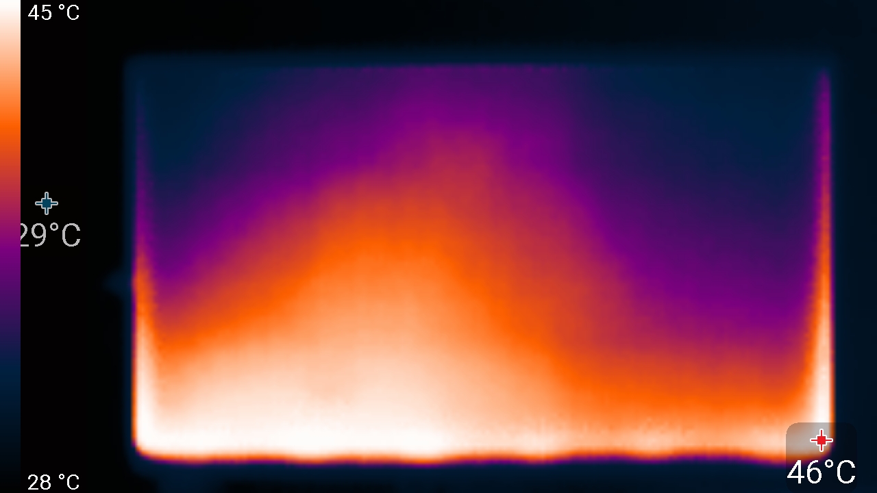 Нижний край экрана нагрелся до 46 °C максимум. Видимо, внизу находится светодиодная линейка подсветки экрана. Нагрев сзади умеренный: