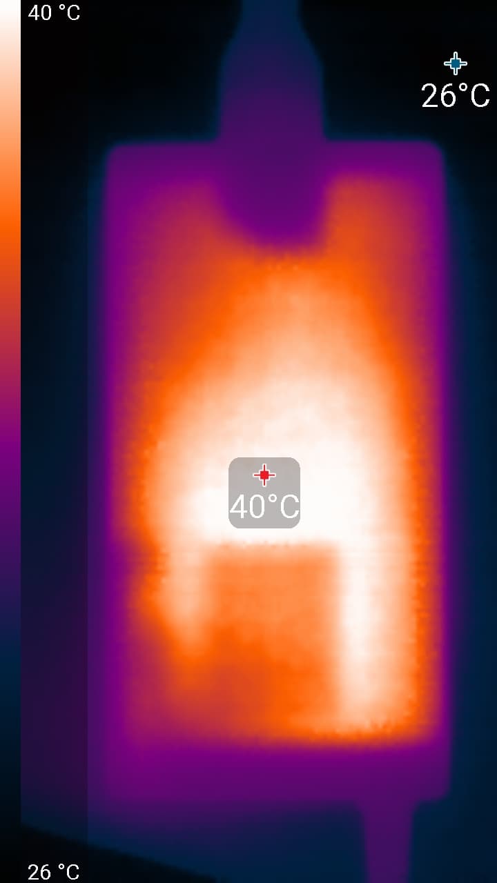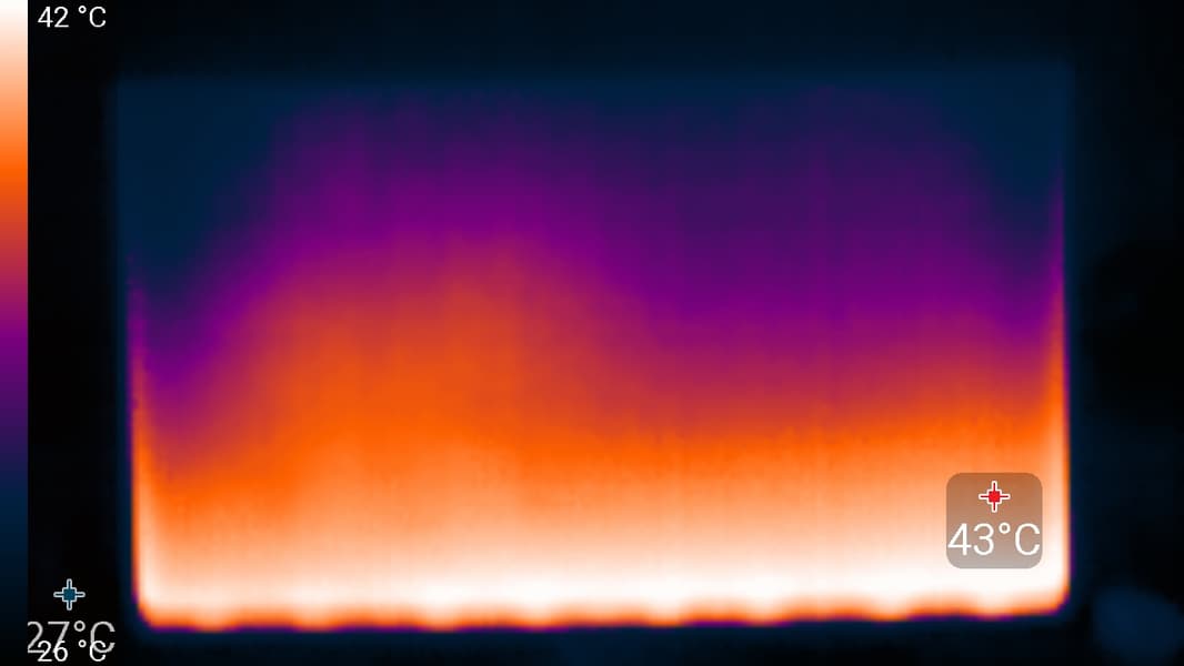 По распределению областей нагрева, можно предположить, что внизу находится светодиодная линейка подсветки экрана. Корпус БП нагрелся всего до 40 °C, что немного: