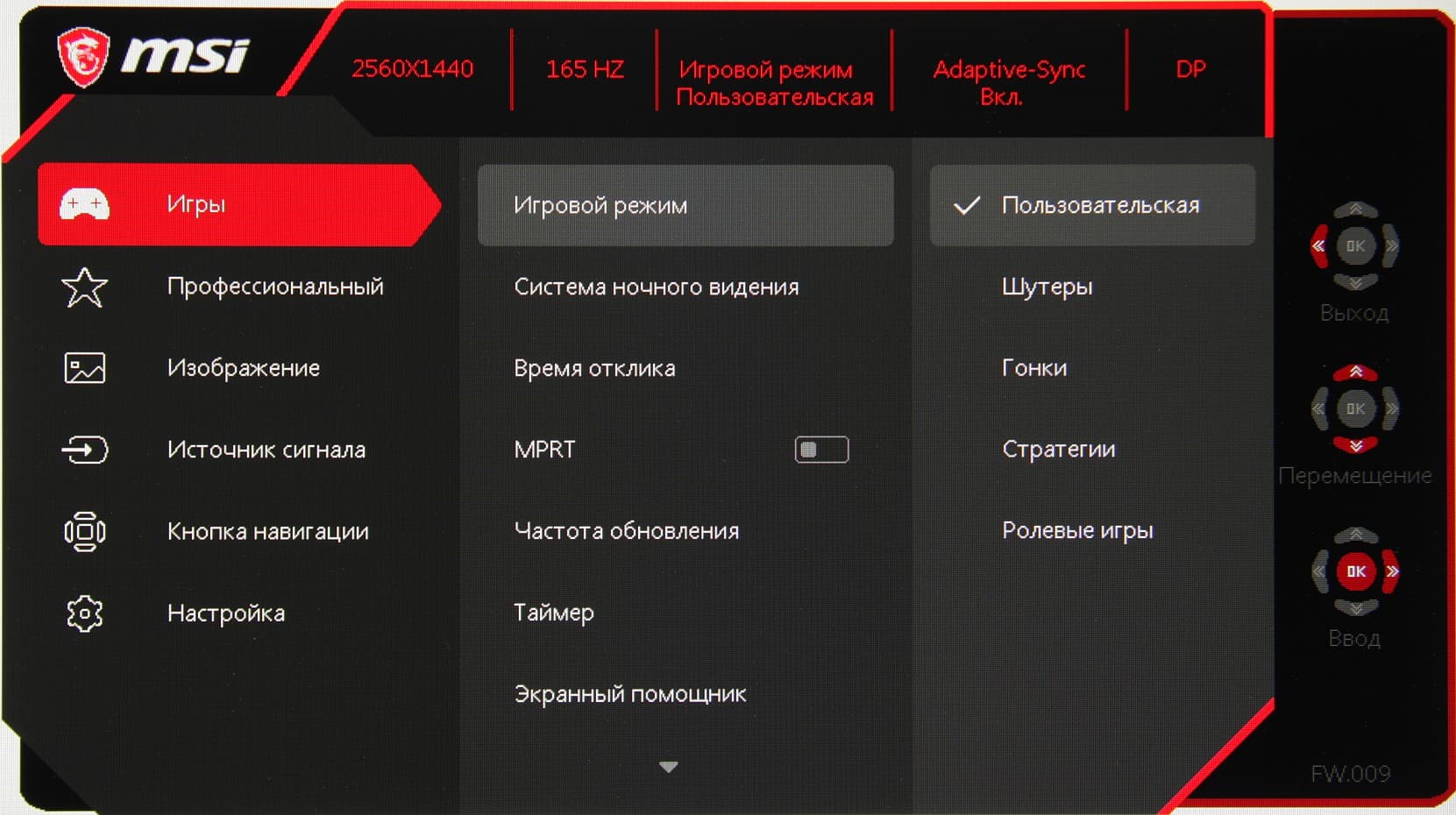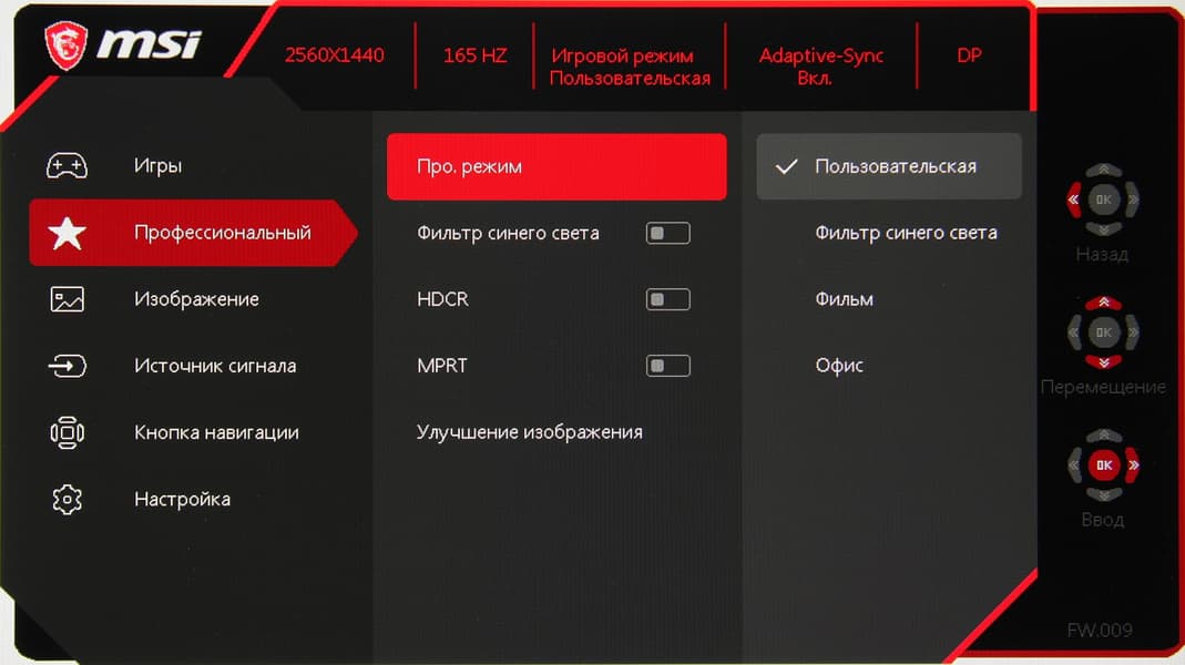 Можно выбрать один из четырех предустановленных профилей с заданными «игровыми» настройками и одновременно с этим один из трех с «профессиональными» настройками изображения. В обоих списках профилей есть еще по одному пользовательскому профилю. Все профили являются редактируемыми.