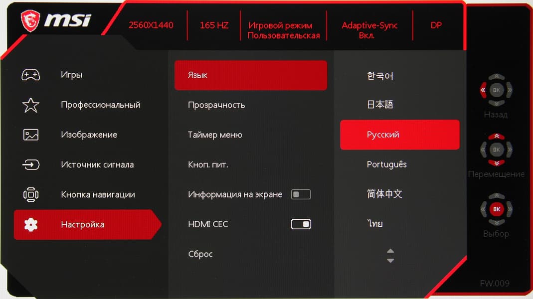 Настраиваются уровень прозрачности фона и задержка автоматического выхода из меню. Присутствует русская версия экранного меню.