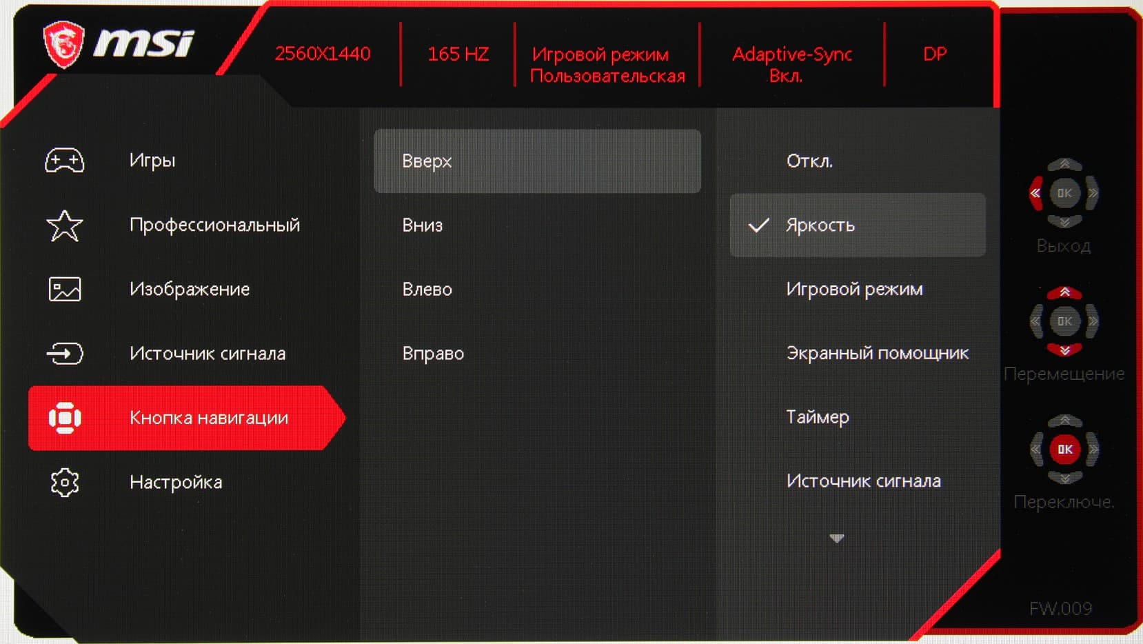 Индикатор питания неярко светится белым (и пользователь при типичной посадке его не видит) при работе, оранжевым — в режиме ожидания, и не горит, если монитор условно выключен. Если монитор работает, и на экране нет меню, то при отклонении джойстика вниз/вверх или вправо/влево на экран выводится та настройка, которая назначена на данное отклонение.
