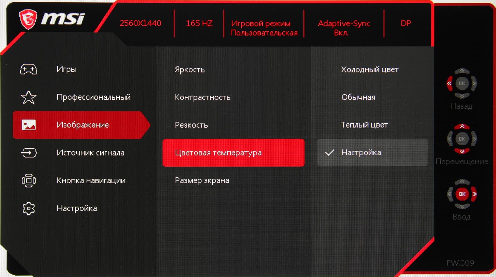 Настроек, влияющих на яркостный и цветовой баланс, не очень много, что для игрового монитора ожидаемо. Есть регулировки яркости (подсветки) и контрастности, краевой четкости (Резкость), подстройка различимости градаций в тенях, функции принудительного снижения интенсивности синей компоненты, включения динамической регулировки яркости подсветки и некая функция Улучшение изображения (ее заметный эффект — это агрессивное увеличение краевой четкости).