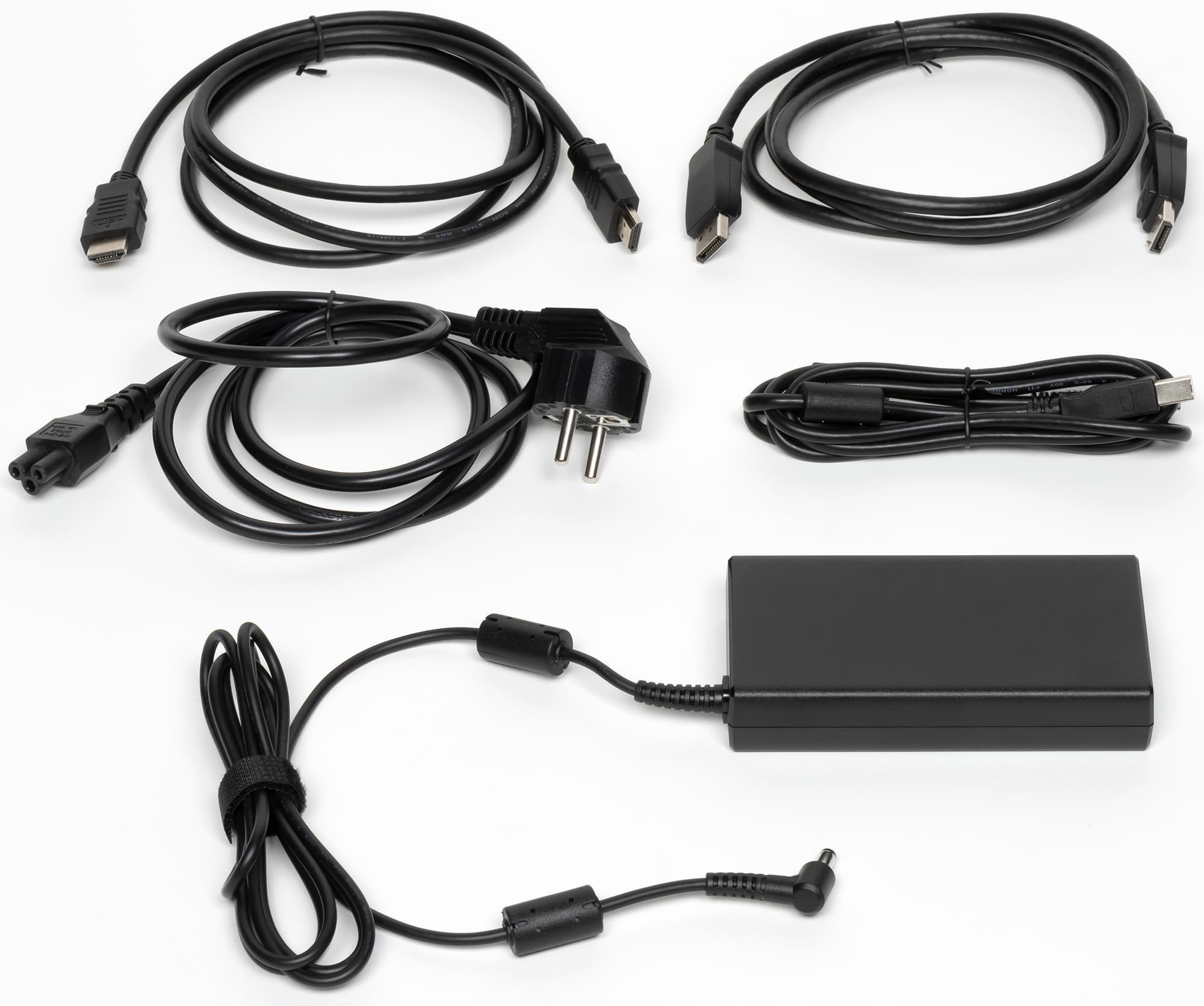 Видеовходов три: пара HDMI версии 2.0b и DisplayPort версии 1.2. Из них только DisplayPort поддерживает на вход сигнал с максимальными для этого монитора разрешением и частотой кадров. Входы выбираются в меню, кроме того, в случае отсутствия сигнала на текущем входе срабатывает автоматический выбор активного входа, который можно отключить. Перечисленные входы способны принимать цифровые аудиосигналы (только PCM стерео), которые выводятся после преобразования в аналоговый вид через гнездо миниджек 3,5 мм. К этому гнезду можно подключить внешнюю активную акустическую систему или наушники. Громкость средствами монитора не регулируется. Мощности выхода на наушники хватило, чтобы в 32-омных наушниках с чувствительностью 92 дБ громкость была достаточной и даже с небольшим запасом. Качество звука в наушниках приемлемое — звук слегка резковат, низких частот маловато, в паузах шума не слышно. В комплект поставки входят два интерфейсных кабеля — HDMI и DisplayPort (кабель USB попал на фотографию случайно).
