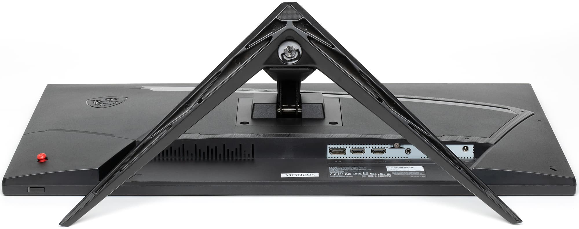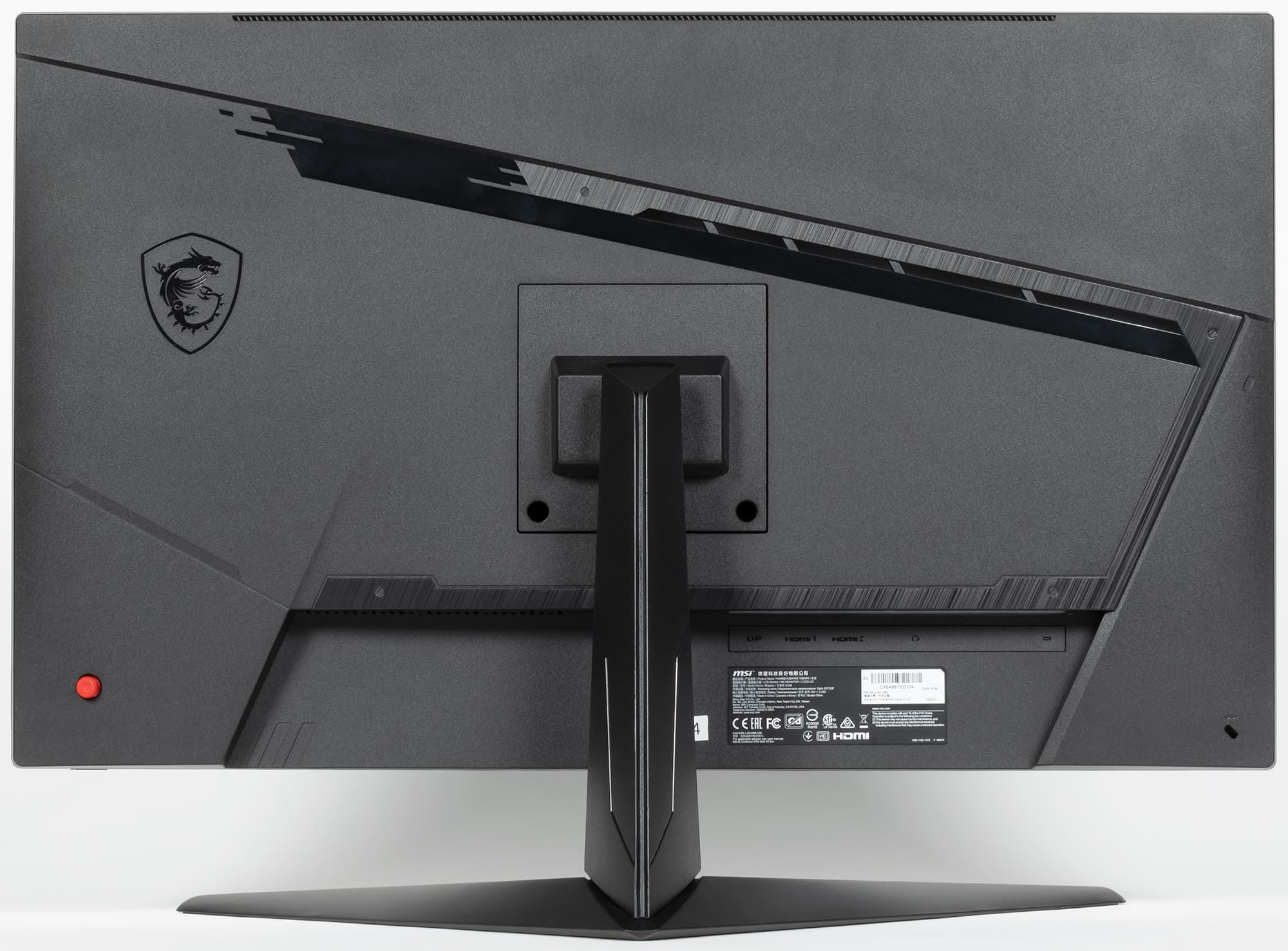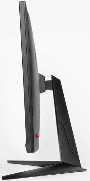 Дизайн явно игровой, но без излишеств. Внешние элементы блока экрана, стойки и узла крепления блока экрана изготовлены из черного пластика в основном с матовой поверхностью, но есть и зеркально-гладкие участки. Ориентацию на игроков выдают дизайн основания подставки, изготовленного из алюминиевого сплава и имеющего стойкое матовое черное покрытие, логотип на задней панели и ее оформление, а также красный цвет джойстика. Внешняя поверхность матрицы плоская черная, полуматовая (зеркальность хорошо выражена), внешний слой матрицы жесткий. Спереди экран выглядит как монолитная поверхность, ограниченная снизу неширокой планкой, а по периметру — узкой окантовкой. Выведя изображение на экран, можно увидеть, что на самом деле между внешними границами экрана и собственно областью отображения есть неширокие поля.