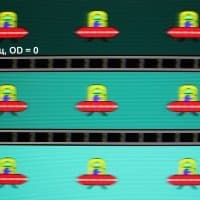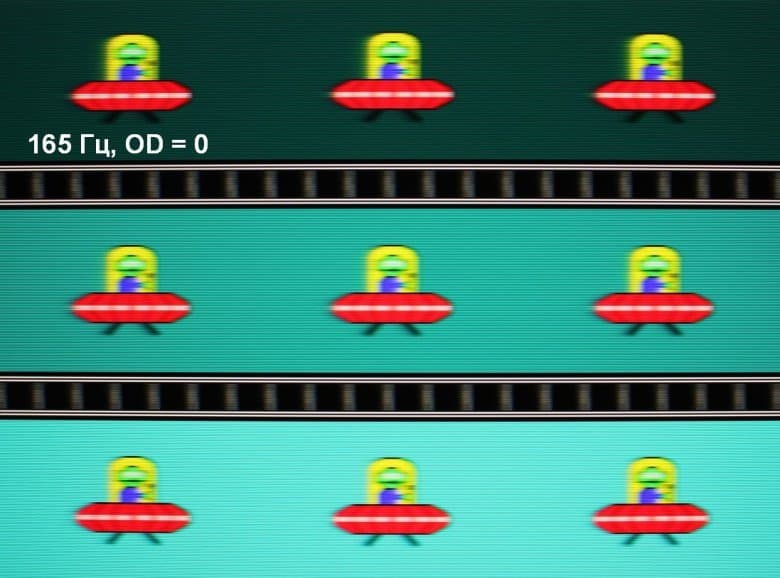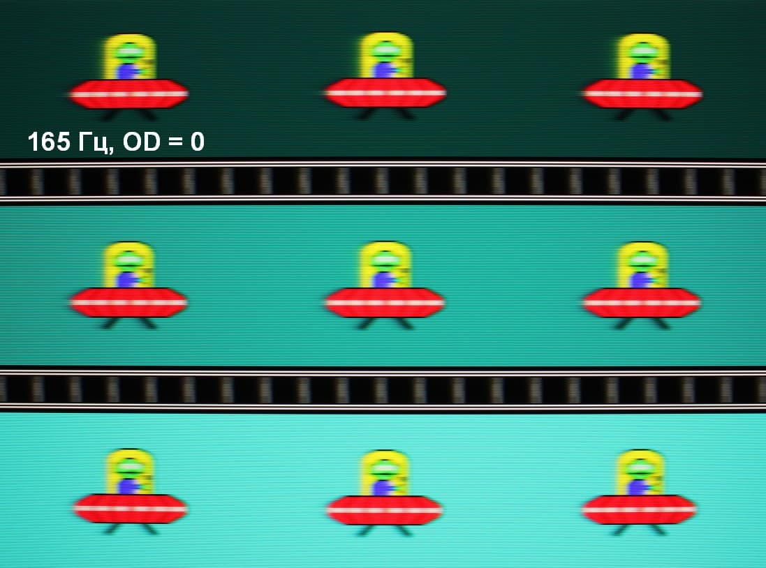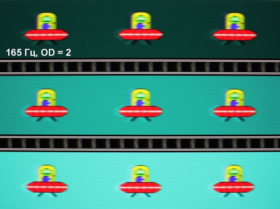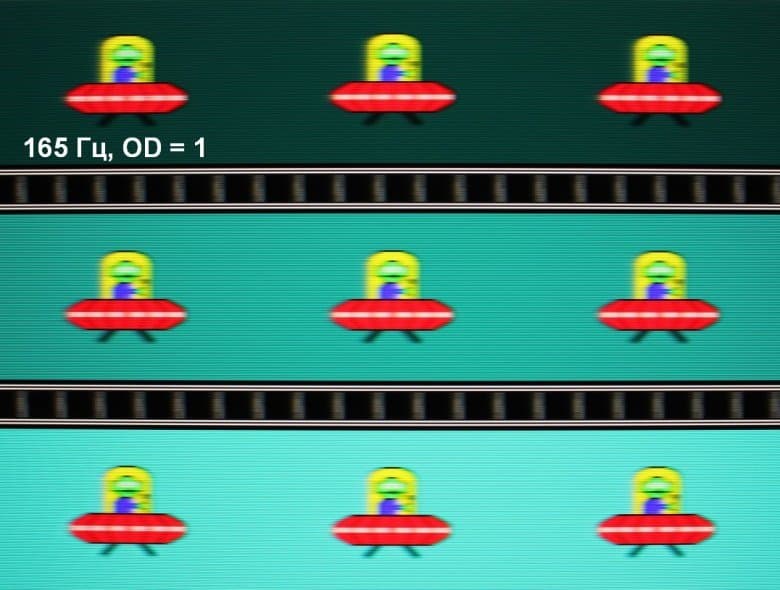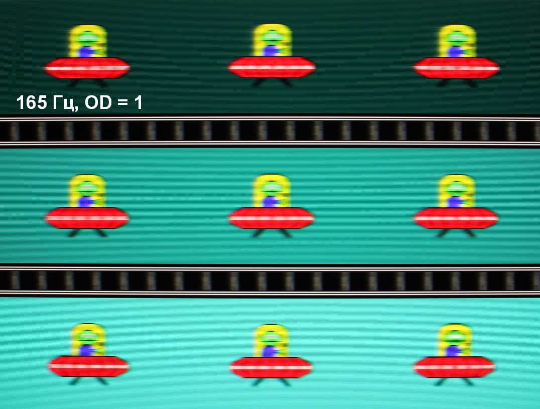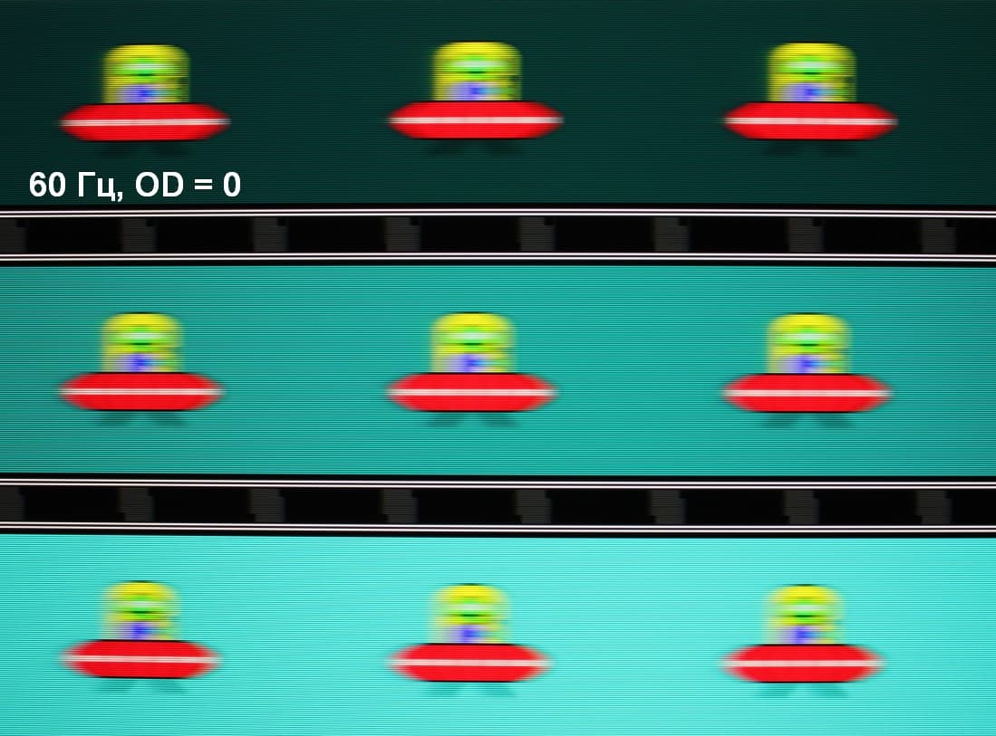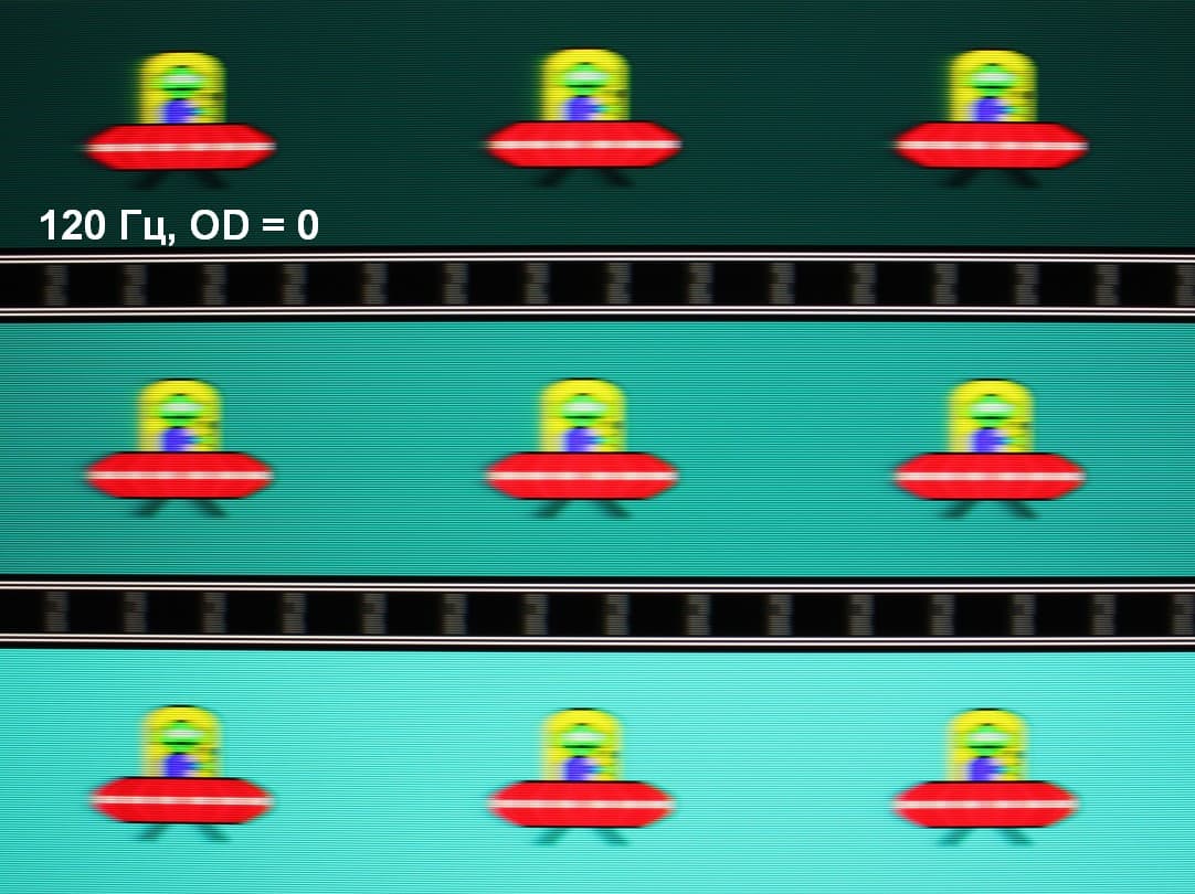 Для наглядного представления о том, что на практике означает такая скорость матрицы, и какие могут быть артефакты от разгона, приведем серию снимков, полученных с помощью движущейся камеры. Такие снимки показывают, что видит человек, если он следит глазами за двигающимся на экране объектом. Описание теста приведено тут, страница с самим тестом тут. Использовались рекомендованные установки (скорость движения 960 или 990 пиксель/с, то есть на целое число пикселей за кадр), выдержка 1/15 с, на фотографиях указаны значения частоты обновления, а также ступень разгона (сокращено до OD — от Overdrive) и включена ли функция вставки черного кадра (MPRT).