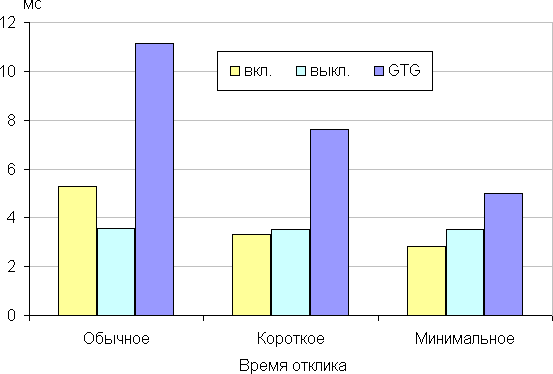 Время отклика зависит от значения одноименной настройки, которая управляет разгоном матрицы. График ниже показывает, как меняется время включения и выключения при переходе черный-белый-черный (столбики «вкл.» и «выкл.»), а также среднее суммарное время для переходов между полутонами (столбики «GTG») для трех значений этой настройки: