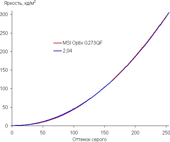 Аппроксимация полученной гамма-кривой дала показатель 2,04, что ниже стандартного значения 2,2, поэтому картинка чуть высветлена. При этом аппроксимирующая степенная функция мало отклоняется от реальной гамма-кривой: