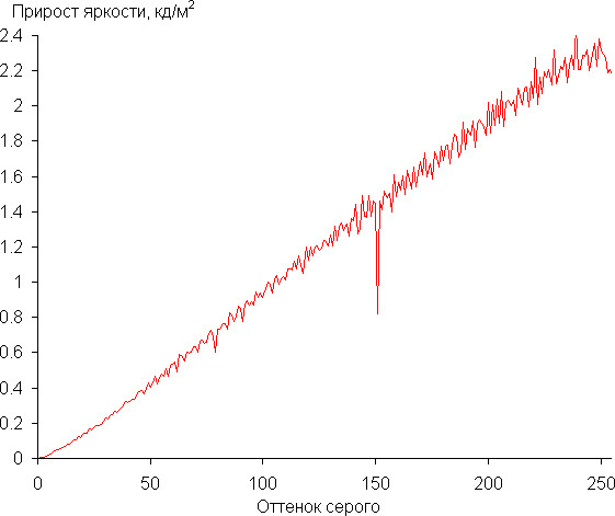 Для оценки характера роста яркости на шкале серого мы измерили яркость 256 оттенков серого (от 0, 0, 0 до 255, 255, 255). График ниже показывает прирост (не абсолютное значение!) яркости между соседними полутонами: