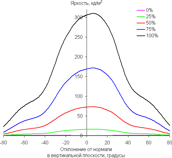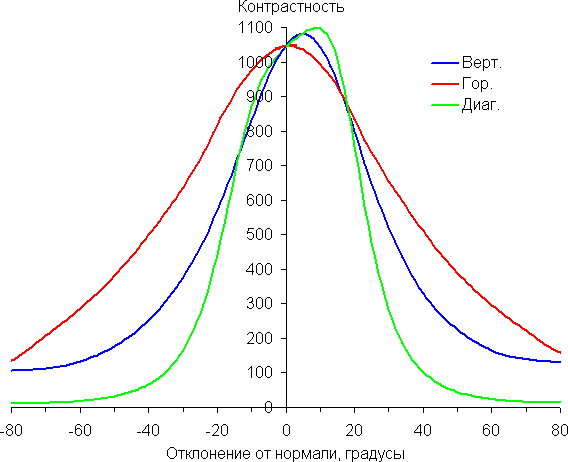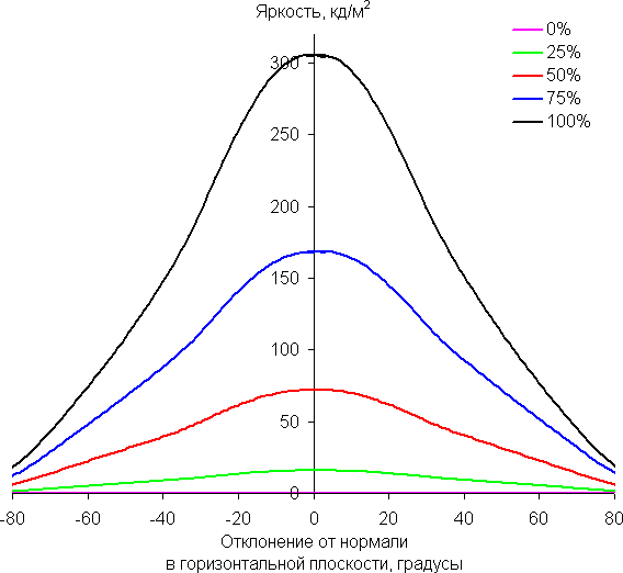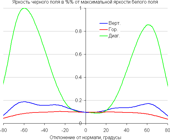 По скорости снижения яркости углы обзора не очень широкие, что для матрицы типа IPS нехарактерно. При отклонении в диагональном направлении яркость черного поля начинает резко возрастать уже при 20°-30° отклонения от перпендикуляра к экрану. Если сидеть не очень далеко от экрана, то черное поле по углам будет заметно светлее, чем в центре (оставаясь практически нейтральным по оттенку). Контрастность в диапазоне углов ±82° остается выше значения 10:1.