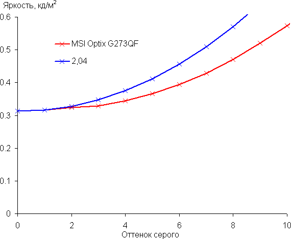 Рост прироста яркости довольно равномерный, и каждый следующий оттенок ярче предыдущего. В тенях все оттенки визуально отличаются по яркости, что для игрового монитора очень полезно: