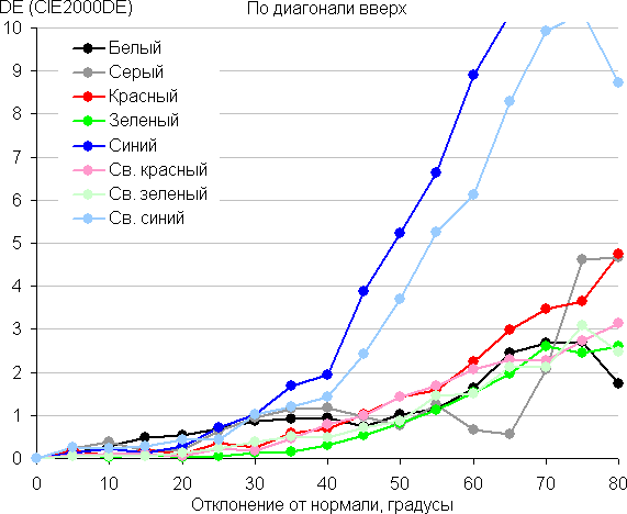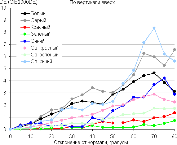 Для количественной характеристики изменения цветопередачи мы провели колориметрические измерения для белого, серого (127, 127, 127), красного, зеленого и синего, а также светло-красного, светло-зеленого и светло-синего полей во весь экран с использованием установки, подобной той, что применялась в предыдущем тесте. Измерения проводились в диапазоне углов от 0° (датчик направлен перпендикулярно к экрану) до 80° с шагом в 5°. Полученные значения интенсивностей были пересчитаны в ΔE относительно замера каждого поля при перпендикулярном положении датчика относительно экрана. Результаты представлены ниже: