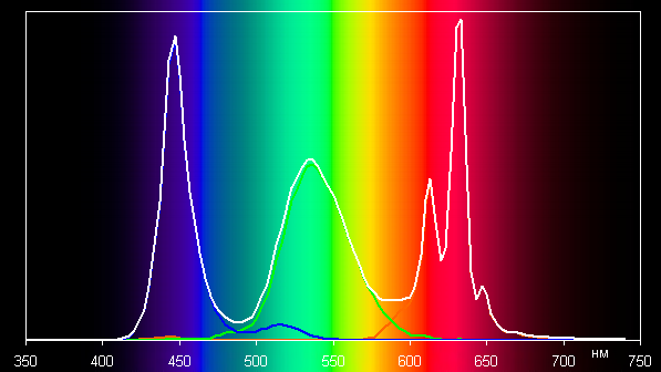 Ниже приведен спектр для белого поля (белая линия), наложенный на спектры красного, зеленого и синего полей (линии соответствующих цветов):