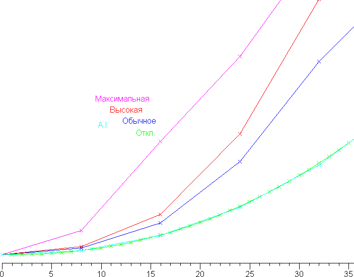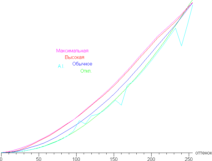 Видно, что меняется только скорость роста яркости в темной области, а уровень черного, а значит и контрастность не меняется, как и должно быть. Автоматический режим (A.I.), видимо, работает в динамике, потому и результат странный.