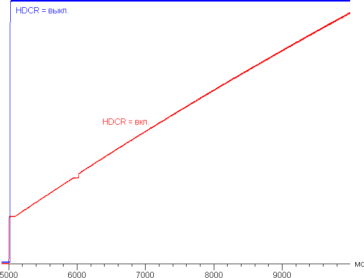 При включении режима с динамическим управлением яркости установившаяся контрастность формально возрастает до бесконечности, так как на черном поле во весь экран подсветка выключается совсем через 10 секунд. Впрочем, уже курсора мыши достаточно для включения подсветки. График ниже показывает, как увеличивается яркость (вертикальная ось) при переключении с черного поля (после пяти секунд вывода) на белое при выключенной и включенной динамической подстройке яркости: