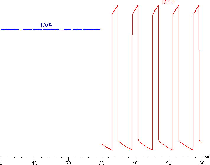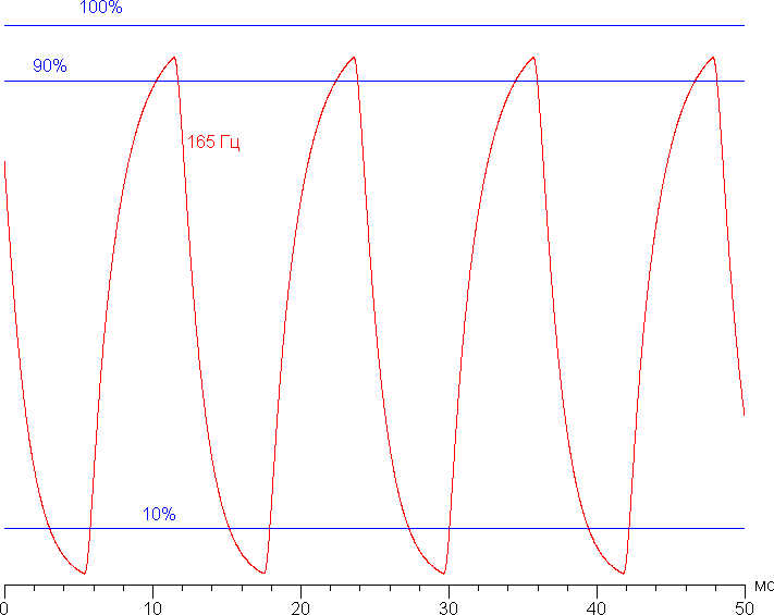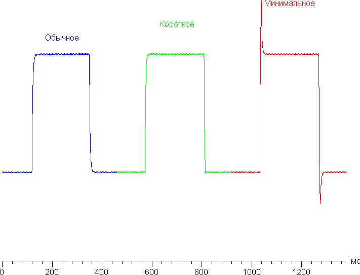 Приведем зависимости яркости (вертикальная ось) от времени (горизонтальная ось) при чередовании белого и черного кадра при 165 Гц кадровой частоты (первая ступень разгона):