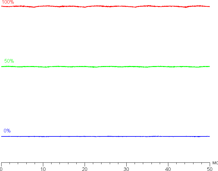 На любом уровне яркости модуляция подсветки отсутствует, что исключает видимое мерцание экрана. Для тех, кто привык распознавать знакомое сокращение, уточним: ШИМ отсутствует. В доказательство приведем графики зависимости яркости (вертикальная ось) от времени (горизонтальная ось) при различных значениях настройки яркости: