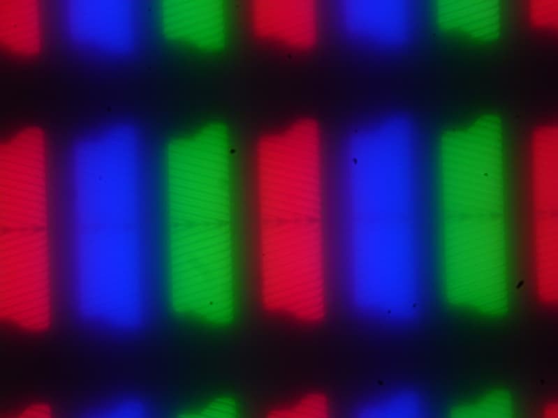 Изображение структуры пикселей из-за матовой поверхности слегка размыто, но характерную для IPS структуру распознать можно (черные точки — это пыль на матрице фотоаппарата):