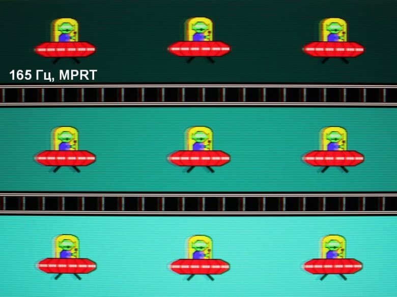 Есть режим со вставкой черного кадра (правда истинно черным он в данном случае не является) с названием MPRT. Зависимости яркости (вертикальная ось) от времени (горизонтальная ось) для выключенного (яркость 100%) и включенного режима MPRT (частота обновления 165 Гц):