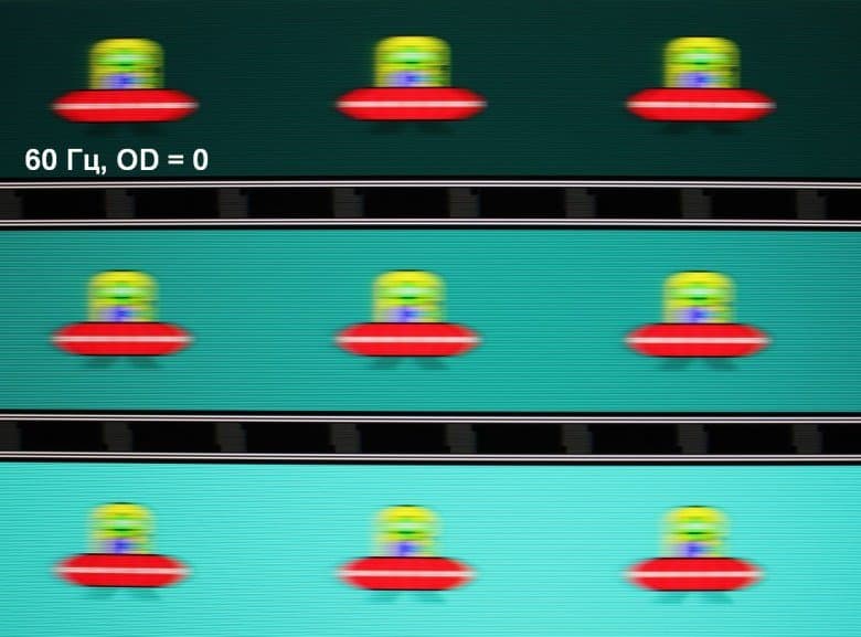 Видно, что при прочих равных условиях четкость изображения повышается по мере роста частоты обновления и степени разгона, и на максимальном разгоне артефакты заметные. Включение вставки черного кадра увеличивает четкость, но за объектами в движении появляются контуры, что снижает положительный эффект.