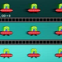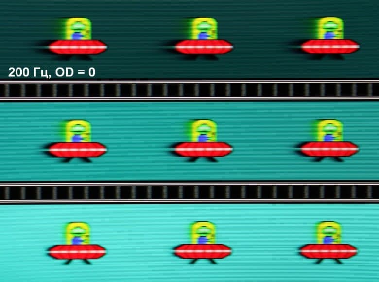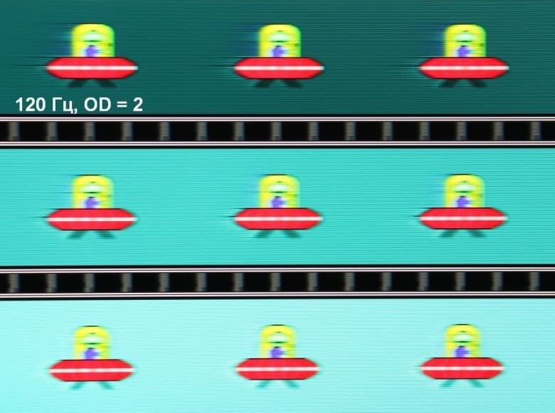 Для наглядного представления о том, что на практике означает такая скорость матрицы, и какие могут быть артефакты от разгона, приведем серию снимков, полученных с помощью движущейся камеры. Такие снимки показывают, что видит человек, если он следит глазами за двигающимся на экране объектом. Описание теста приведено тут, страница с самим тестом тут. Отметим, что получить хорошие по качеству снимки в этом тесте в случае изогнутого монитора сложно. Использовались рекомендованные установки (скорость движения 960, 1000 или 1008 пиксель/с, то есть на целое число пикселей за кадр), выдержка 1/15 с, на фотографиях указаны значения частоты обновления, а также ступень разгона (сокращено до OD — от Overdrive) и включена ли функция вставки черного кадра (BFI).
