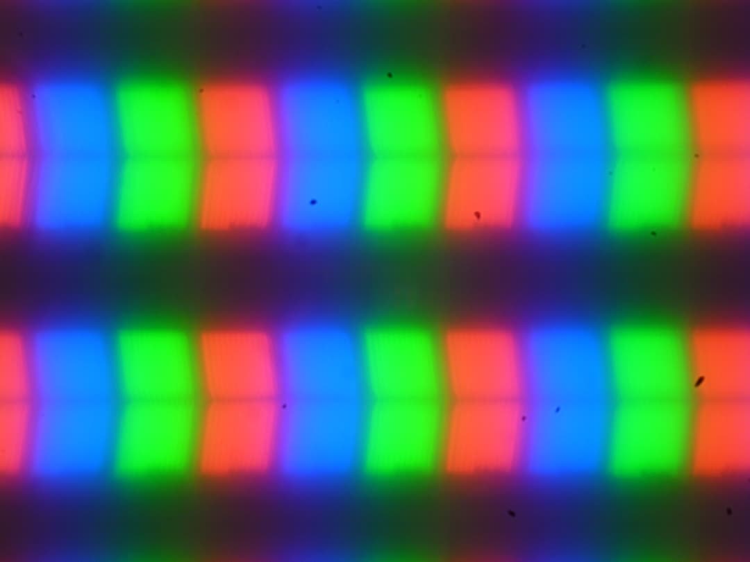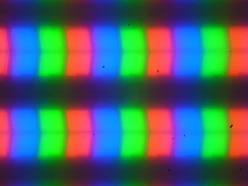 Из-за матовой поверхности экрана четкого изображения пикселей получить не удалось (черные точки — это пыль на матрице фотоаппарата), однако характерная для IPS структура субпикселей просматривается: