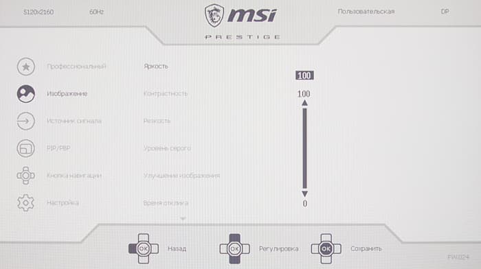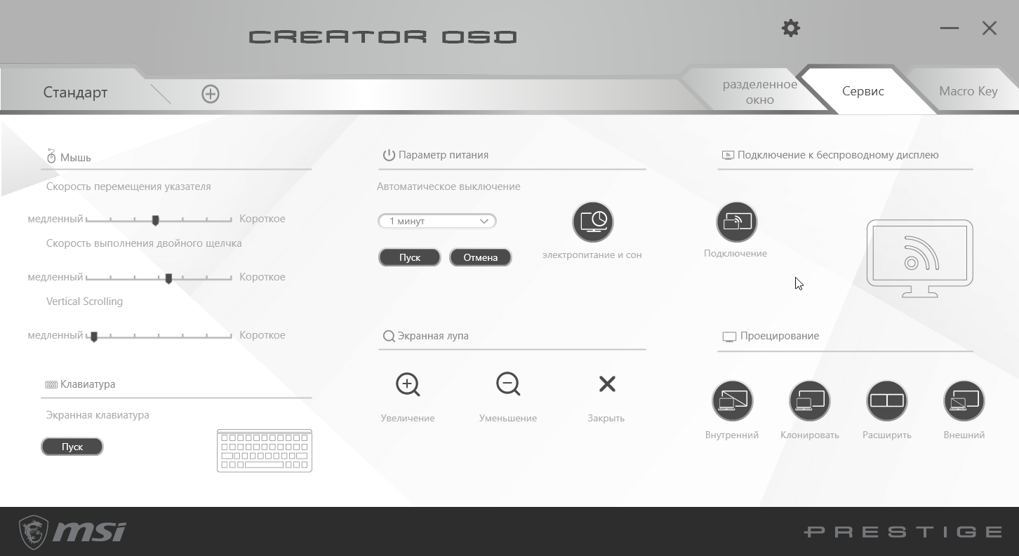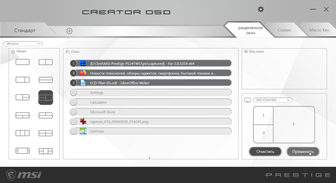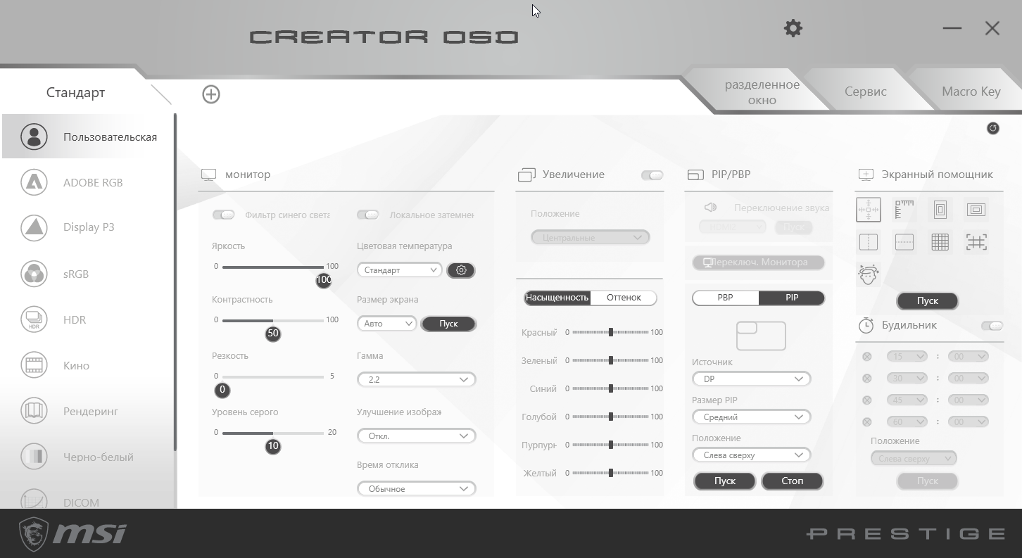 - ПО MSI Creator OSD для настройки монитора и для организации окон
