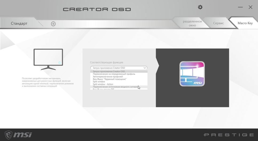 С сайта компании можно загрузить программу MSI Creator OSD. Она позволяет настраивать монитор с компьютера, помогает распределять окна программ на рабочем столе, дает доступ к некоторым настройкам ПК и позволяет назначить на кнопку на мониторе выполнение одного из ряда действий: