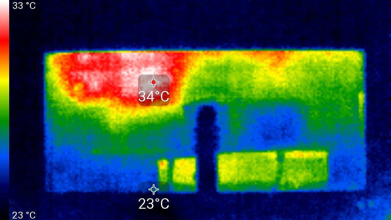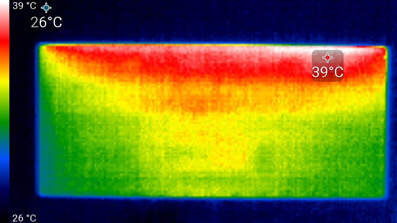 Спереди в верхней части экрана была зафиксирована максимальная температура в 40 °C — видимо, там находится светодиодная линейка подсветки экрана. Сзади локально температура достигает 34 °C.