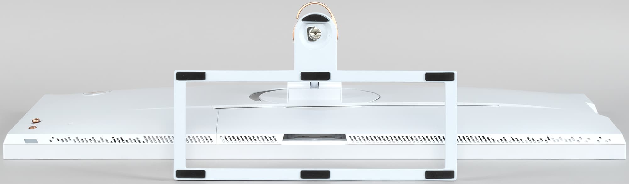 Подставка состоит из двух частей — из основания и стойки. Чтобы выдержать вес монитора, основание и ряд ответственных деталей изготовлены из алюминиевого сплава или толстой штампованной стали. Конструкция подставки достаточно жесткая. Стоит монитор устойчиво. Резиновые накладки снизу на основании подставки защищают поверхность стола от царапин и предотвращают скольжение монитора на гладких поверхностях. Основание выполнено в виде прямоугольной рамки, поэтому место на рабочем столе не пропадает — в рамке можно хранить всякую мелочевку и ничего никуда не укатится. Также в дальних от пользователя углах есть магнитные участки, на которых с помощью пресс-папье, входящим в комплект поставки (мы его в коробке не нашли), можно фиксировать разные бумаги. Основание имеет стойкое белое матовое покрытие.