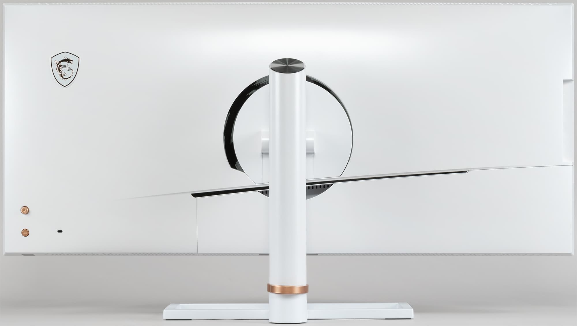 Органом управления служит небольшой пятипозиционный (отклонение по четырем направлениям и нажатие) джойстик, расположенный на задней панели под правую руку. Кнопка ниже работает в связке с ПО MSI Creator OSD. Еще ниже на скошенной к нижнему торцу грани блока монитора находится полупрозрачный светорассеиватель индикатора состояния, являющийся по совместительству кнопкой питания. Также рядом расположен разъем для кенсингтонского замка.