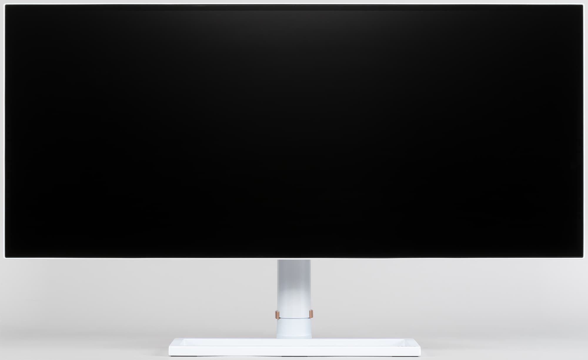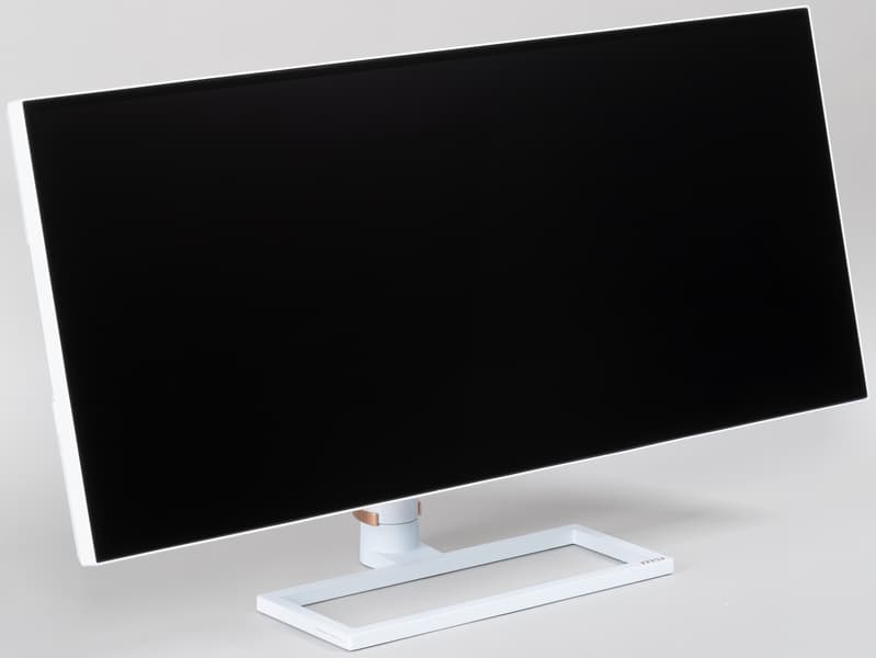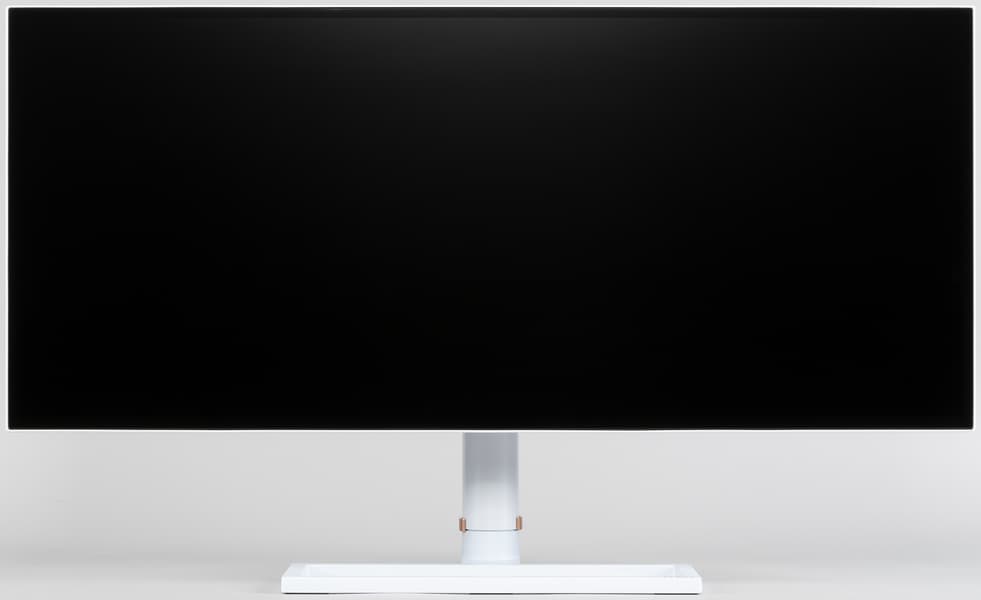 Фронтальная поверхность экрана выглядит как монолитная черная полуматовая (зеркальность отчасти присутствует) плоскость, ограниченная по периметру узкой окантовкой. Выведя изображение на экран, можно увидеть, что на самом деле между внешними границами экрана и собственно областью отображения есть неширокие поля.