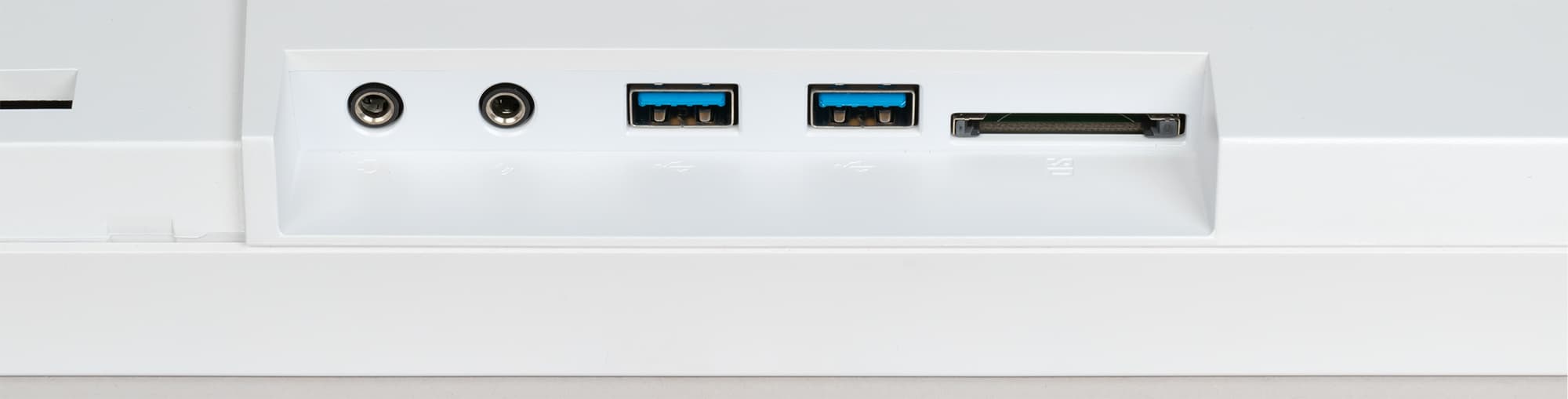 Монитор оснащен четырьмя цифровыми входами: двумя HDMI, DisplayPort в полноразмерном варианте и по сути тоже DisplayPort в виде разъема USB типа C. Последний вход работает только как видео/аудиовход, и не работает как вход концентратора USB, что странно и неудобно в случае подключения монитора к ноутбуку. Выбор входа осуществляется в меню установок или в быстром меню. Есть функция автоматического поиска сигнала на входах. Есть встроенный концентратор USB 3.0 (или, как теперь принято писать, USB 3.2 Gen 1) на три порта, к которому подключен встроенный SD-картовод. Как написано в руководстве, один выход USB и вход USB-C могут выдавать на подключенное устройство до 5 В/3 А. Цифровые аудиосигналы, передаваемые на входы DisplayPort, USB-C и HDMI, после преобразования в аналоговый вид выводятся через гнездо миниджек 3,5 мм. К этому гнезду можно подключить внешнюю активную акустическую систему или наушники. Также этот выход может работать в режиме сквозного подключения к аудиовыходу другого устройства (к ПК, например). В этом же режиме работает и микрофонный вход. Для реализации сквозного подключения нужно подключить монитор к аудиовыходу и микрофонному входу (оба должны быть гнездами миниджек 3,5 мм) с помощью специального кабеля, входящего в комплект поставки. Выход на наушники, два из трех выходов USB, а также SD-картовод и микрофонный вход расположены в нише близко к левой грани блока монитора, поэтому подключаться к ним и использовать картовод удобно. Тестирование показало, что мощности выхода на наушники хватило, чтобы в 32-омных наушниках с чувствительностью 92 дБ был большой запас по громкости. Качество звука в наушниках хорошее: звук чистый, в паузах шума не слышно, диапазон воспроизводимых частот широкий.