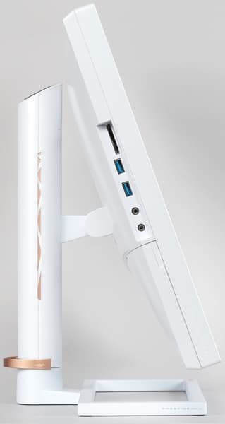 При типичной посадке пользователь индикатор не видит, видно только свет, отраженный от плоскости стола. Обрамление блока экрана, задняя панель и кожухи подставки изготовлены из пластика с белым матовым покрытием. Задняя панель имеет слегка асимметричный вид, а две темные вставки на задней панели символизируют мазки кисти — круг и слегка изогнутую линию. Нишу с разъемами можно прикрыть декоративной крышкой, которая крепится на пластиковых защелках, а отходящие кабели собрать в аккуратный пучок и прижать к стойке подставки, воспользовавшись входящим в комплект кабельным зажимом. Дополнительно кабели фиксируются вторым кабельным зажимом, находящимся в нише с разъемами. В итоге сзади монитор выглядит очень аккуратно.