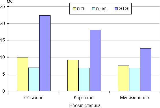 Время отклика зависит от значения одноименной настройки, которая управляет разгоном матрицы. Ступени регулировки три. График ниже показывает, как меняется время включения и выключения при переходе черный-белый-черный (столбики «вкл.» и «выкл.»), а также среднее суммарное время для переходов между полутонами (столбики GTG):
