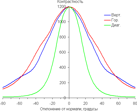 Отметим плавное уменьшение яркости при отклонении от перпендикуляра к экрану в горизонтальном направлении, при этом графики не пересекаются во всем диапазоне измеряемых углов. Чуть быстрее падает яркость при отклонении в вертикальном направлении. При отклонении в диагональном направлении поведение яркости оттенков имеет промежуточный характер между вертикальным и горизонтальным направлениями, за исключением яркости черного поля, которая начинает резко возрастать уже при 20°-30° отклонения от перпендикуляра к экрану. Если сидеть от экрана на расстоянии 50-60 см, то черное поле по углам будет заметно светлее, чем в центре. Контрастность в диапазоне углов ±82° в случае отклонения по диагонали приближается к отметке 10:1, но не опускается ниже.