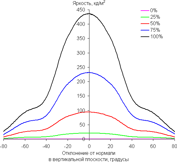 В качестве реперной точки можно выбрать отклонение в 45°, что может быть актуальным в случае, например, если изображение на экране рассматривают два человека одновременно. Критерием сохранения правильности цветов можно считать значение ΔE меньше 3. Стабильность цветов хорошая, это является одним из главных достоинств матрицы типа IPS, хотя, стоит отметить, что встречаются IPS-матрицы, у которых стабильность цветов еще выше.