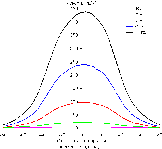 Чтобы выяснить, как меняется яркость экрана при отклонении от перпендикуляра к экрану, мы провели серию измерений яркости черного, белого и оттенков серого в центре экрана в широком диапазоне углов, отклоняя ось датчика в вертикальном, горизонтальном и диагональном (из угла в угол для формата 16:9) направлениях.