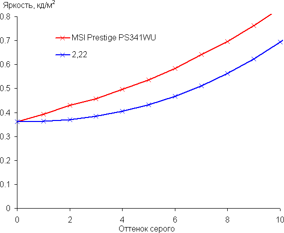 Аппроксимация (уже по 256 точкам) полученной гамма-кривой дала показатель 2,22, что чуть-чуть выше стандартного значения 2,2, при этом реальная гамма-кривая почти не отклоняется от аппроксимирующей степенной функции: