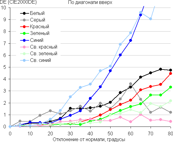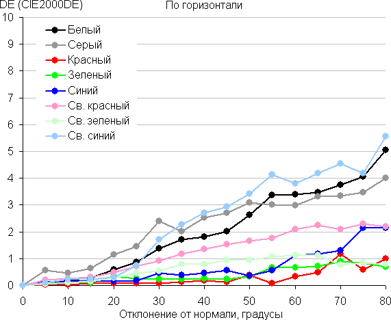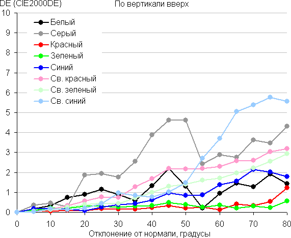 Для количественной характеристики изменения цветопередачи мы провели колориметрические измерения для белого, серого (127, 127, 127), красного, зеленого и синего, а также светло-красного, светло-зеленого и светло-синего полей во весь экран с использованием установки, подобной той, что применялась в предыдущем тесте. Измерения проводились в диапазоне углов от 0° (датчик направлен перпендикулярно к экрану) до 80° с шагом в 5°. Полученные значения интенсивностей были пересчитаны в ΔE относительно замера каждого поля при перпендикулярном положении датчика относительно экрана. Результаты представлены ниже: