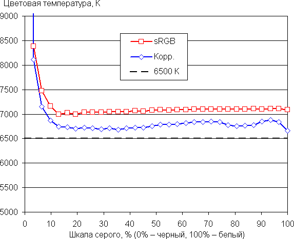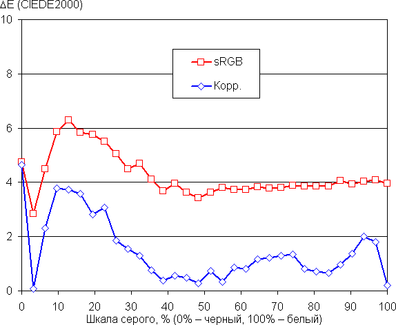 Самый близкий к черному диапазон можно не учитывать, так как в нем цветопередача не так важна, а погрешность измерения цветовых характеристик высокая. По потребительским критериям встроенный заводской профиль sRGB и без коррекции достаточно хорош, но с профессиональной точки зрения ΔE в нем все же высоковата. Ручная коррекция существенно уменьшила ΔE и приблизила цветовую температуру к стандартным 6500 К. Отметим, что шаг регулировки интенсивности основных цветов великоват, для более точной настройки он должен быть раза в 2-4 мельче.
