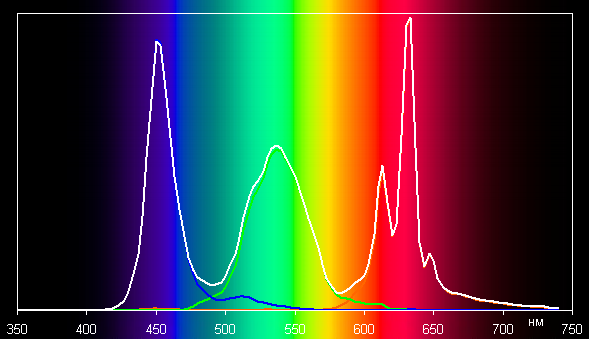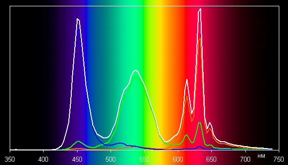 Ниже приведен спектр для белого поля (белая линия), наложенный на спектры красного, зеленого и синего полей (линии соответствующих цветов), когда нет корректировки цветового охвата (или она минимальная):