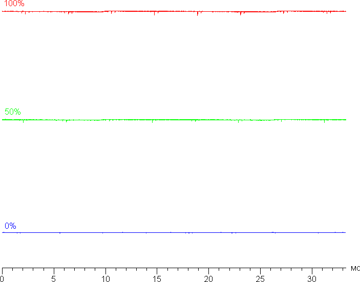 Яркость монитора меняется именно яркостью подсветки, то есть без ущерба для качества изображения (сохраняется контрастность и количество различимых градаций) яркость монитора можно менять в достаточно широких пределах, что позволяет с комфортом работать и смотреть фильмы как в освещенном, так и в темном помещении. На любом уровне яркости мало-мальски значимая модуляция подсветки отсутствует, что исключает видимое мерцание экрана. В доказательство приведем графики зависимости яркости (вертикальная ось) от времени (горизонтальная ось) при различных значениях настройки яркости: